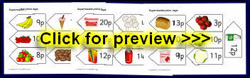 This fantastic pack includes brightly coloured posters for all sorts of products that can be found in a typical supermarket. Also includes a Supermarket banner, printable cheque books, shopping lists, price tags and other signs.