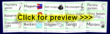 A set of 28 different labels for your science store cupboard. Includes things such as mirrors, bulbs, magnets, crocodile clips, batteries, magnifying glasses and more.