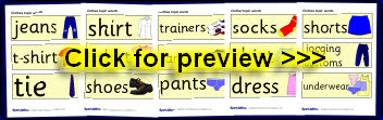 A set of word cards with accompanying pictures linked to a topic on clothes. Great for classroom displays, word banks or laminating for other topic-related activities.