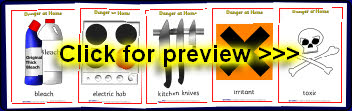 A printable set of A4 posters showing various hazardous things found at home and warning symbols.