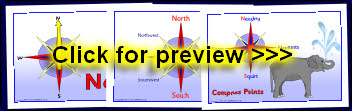 A set of posters showing the basic compass directions, a labelled compass, along with a ‘Naughty Elephants Squirt Water’ visual aid.