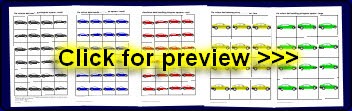 Printable squares featuring different coloured cars. Ideal for use when creating a pictogram to showing the results of a car colour traffic survey.