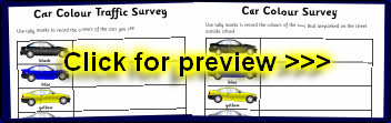 Printable worksheets for children to survey the colours of cars passing in traffic or parked around the school.