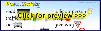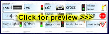 A simple printable desktop word mat with words and pictures linked to road travel and safety.