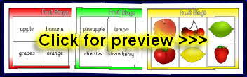 A set of bingo boards and picture cards featuring a selection of fruit. Includes both word and picture boards.