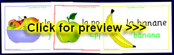 A set of 14 A4-sized printable posters showing common fruit together with their names in French and English.