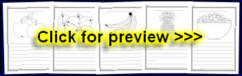 A set of simple printable sheets featuring images of fruit from the popular story for children to colour along with writing lines for writing.