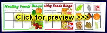 Bingo boards and picture cards where pupils fill their board with either healthy or unhealthy foods.