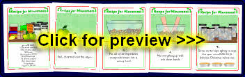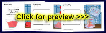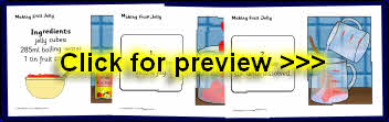 A useful set of simple visual aids showing how to make jelly in 5 steps. It includes instructional text and a list of ingredients with accompanying pictures. These could be laminated and used when actually making the jelly or used for classroom displays and discussion afterwards.