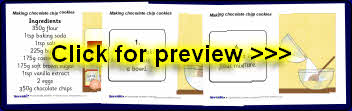 A useful set of simple visual aids showing how to make chocolate chip cookies in 9 steps. It includes instructional text and a list of ingredients. Also perfect for use in a classroom display.