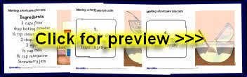 A useful set of simple visual aids showing how to make shortcake biscuits in 9 steps. It includes instructional text and a list of ingredients. Also perfect for use in a classroom display.