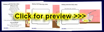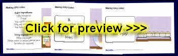 A useful set of simple visual aids with instructions on making fairy cakes in 12 steps. Each child can add and mix their own ingredients to make their own individual fairy cake(s). It includes simple instructional text and a list of ingredients.