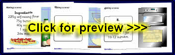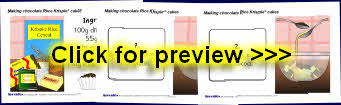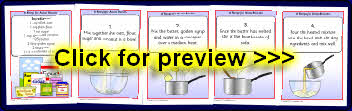 A useful and colourful set of simple visual aids showing how to make a chocolate Rice Krispie cereal cakes in 7 steps. It includes instructional text and a list of ingredients with accompanying pictures. These could be laminated and used when actually making the cakes, or for classroom displays and discussion afterwards.