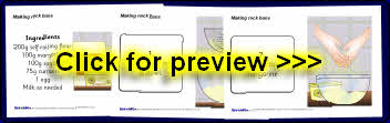 A useful set of simple visual aids showing how to make rock buns in 7 steps. It includes instructional text and a list of ingredients. Also perfect for use in a classroom display.