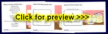 A useful set of simple visual aids with instructions on making butterfly cakes. Each child can add and mix their own ingredients to make their own individual fairy cake(s). It includes simple instructional text and a list of ingredients.