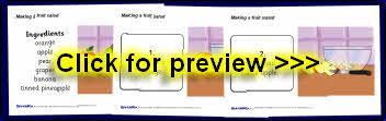 A useful set of simple visual aids showing how to make a fruit salad in 7 steps. It includes instructional text and a list of ingredients and accompanying pictures. These could be laminated and used when actually making the salad, or for classroom displays and discussion afterwards.