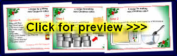 A great set of visual aids showing how to make 12 mini Christmas cakes. It includes simple instructional text and a list of ingredients.