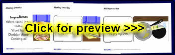A useful set of simple visual aids showing how to make toasties in 8 steps. It includes instructional text and a list of ingredients. Also perfect for use in a classroom display.