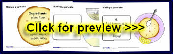 A useful set of visual aids showing how to make a pancake in 6 steps. It includes instructional text and a list of ingredients, together with a sheet that can be photocopied for children to sequence the pictures.