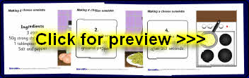 A useful set of simple visual aids showing how to make a cheese omelette in 8 steps. It includes instructional text and a list of ingredients. Also ideal for use in a classroom display.