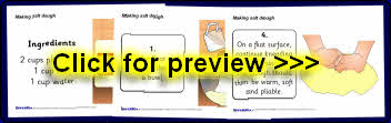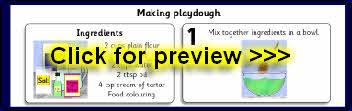 A simple sheet that can be laminated with an ingredients list and basic instructions to make playdough. Includes both microwave and pan cooking versions.