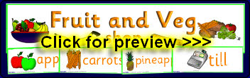 A very useful set of printable resources for use in your Fruit and Vegetable Shop role-play area. Includes a resizable banner image, signs and labels as well as printable cheque books, shopping lists and price tags.