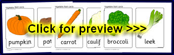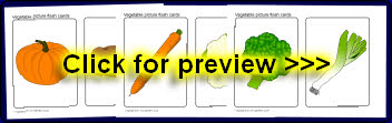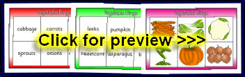 A set of bingo boards and picture cards featuring a selection of vegetables. Includes both word and picture boards.