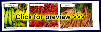 A set of A4-sized printable posters showing various fruit and vegetables.