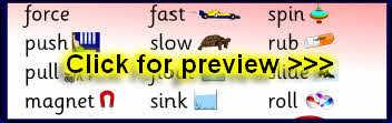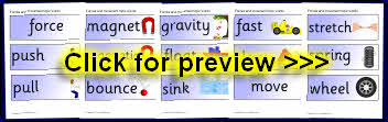A useful set of printable word cards with pictures, linked to ‘forces and movement’. Words such as ‘push’, ‘pull’, ‘bounce’, ‘float’, ‘sink’ and ‘spin’ are included. These are great for use in a classroom word bank, as visual aids or for use on a display board.