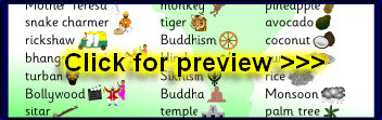 A printable word mat featuring words and pictures linked to India.