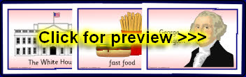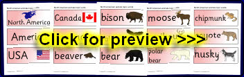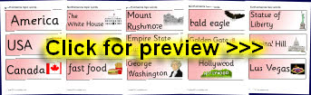 A set of word and picture cards with various places, people and items associated with North America. Great for classroom displays and word banks.