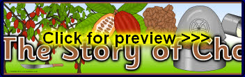 A set of posters showing the process of making chocolate from cacao tree plantations to the factory.