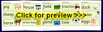 A set of 22 words with accompanying pictures linked to a topic on ‘Farms’. Great for classroom displays, word banks or laminating for other topic-related activities.
