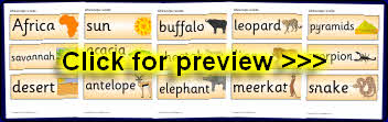A set of printable word cards with pictures of animals, plants, fruit and other items associated with Africa. Includes savannah and desert animals as well as domestic livestock. Brilliant for use in a topic word bank or on classroom displays.