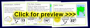 A set of 12 A4 posters with climate and weather facts about various places around the world. Includes posters for places with tropical climates, monsoon as well as temperate and colder climates.