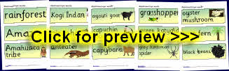 A brilliant set of 40 A4-sized pictures with accompanying words showing rainforest plants, animals, insects, food and people. Ideal for use on classroom displays or to aid topic-related discussion.