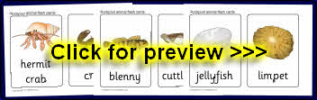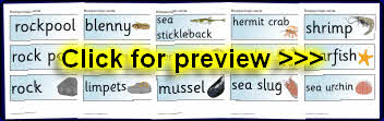 A set of printable picture cards featuring various rockpool animals. Also includes a set of smaller word cards for matching activities.