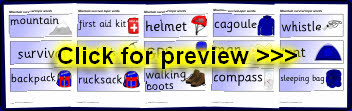 A set of printable word and picture cards linked to mountain survival.