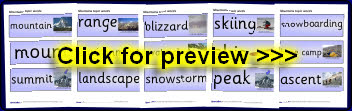 A set of printable word and photo cards with words linked to mountains.