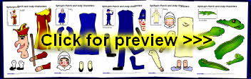 A group of body part sets which can be assembled into split-pin characters with moving parts. Children cut out the body parts and use split-pins to join together at the appropriate places.