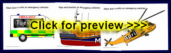A set of photos of various emergency vehicles such as police car, helicopter, jeep, dinghy and ambulance.