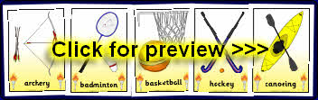 A set of printable cards for a matching activity where children can match equipment pictures to the Olympic sport names.