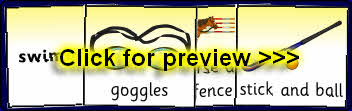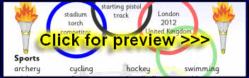 A set of printable word and picture cards featuring items and words associated with the Olympic Games.