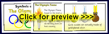 A set of posters with information about symbols of the Olympics including the rings, flame and medals.