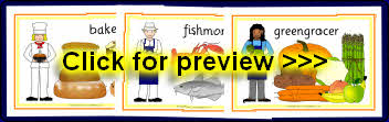 A set of printable cards for a matching activity where children can match the workers to the produce they provide. Great for promoting topic-related discussion.