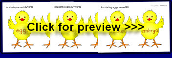 Cartoon chicks featuring vocabulary related to chicken egg incubation and hatching.