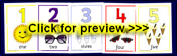 A set of printable posters featuring the numbers and words from 1 to 20 along with a matching number of summer objects on each poster.