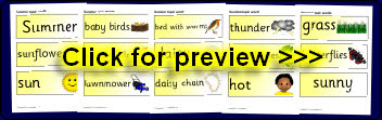 A set of printable word cards with accompanying pictures linked to the season of Summer.