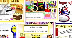 A group of 5 simple certificates to present to members of various sports clubs: football team, tag-rugby team, netball team, Dance Club, and athletics team.
