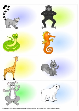 A set of editable sticker templates (8 stickers per A4 page) designed to be printed on Avery Labels J8165. Add your own text to stickers featuring a variety of fun cartoon animals.